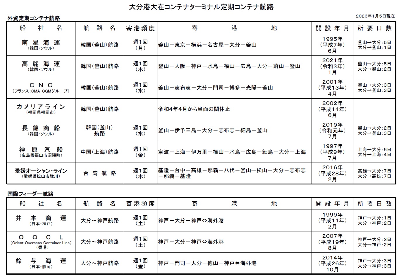 大分港大在コンテナターミナルは「外貿定期コンテナ航路」として韓国航路 週5便(内1便休止)、中国航路 週1便、台湾航路 週1便が、「国際フィーダー航路」として神戸航路 週3便が就航しています。