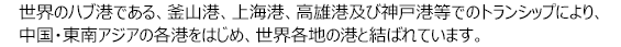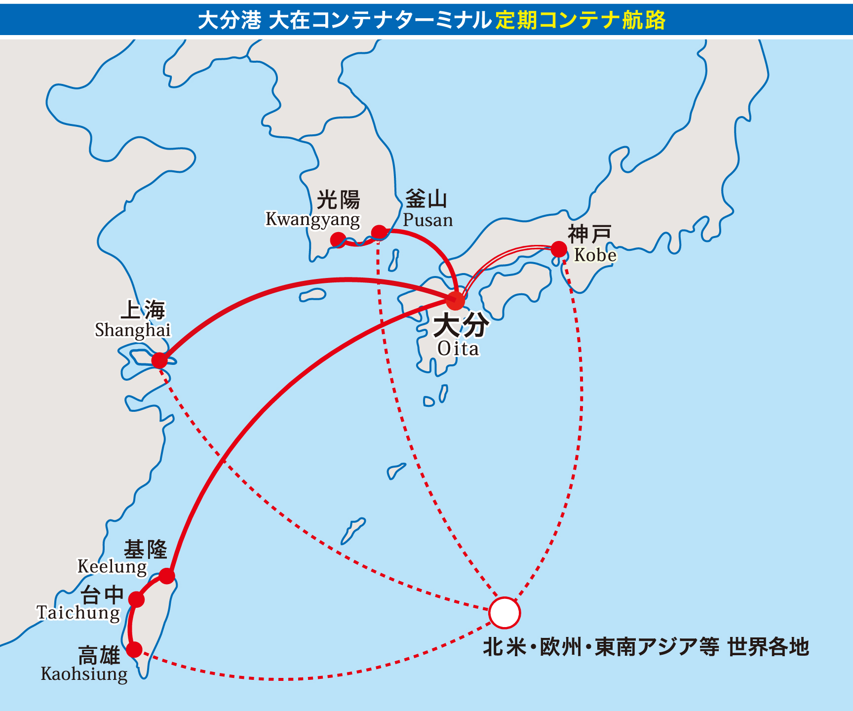 大分港大在コンテナターミナルは「外貿定期コンテナ航路」として韓国航路 週5便(内1便休止)、中国航路 週1便、台湾航路 週1便が、「国際フィーダー航路」として神戸航路 週3便が就航しています。
